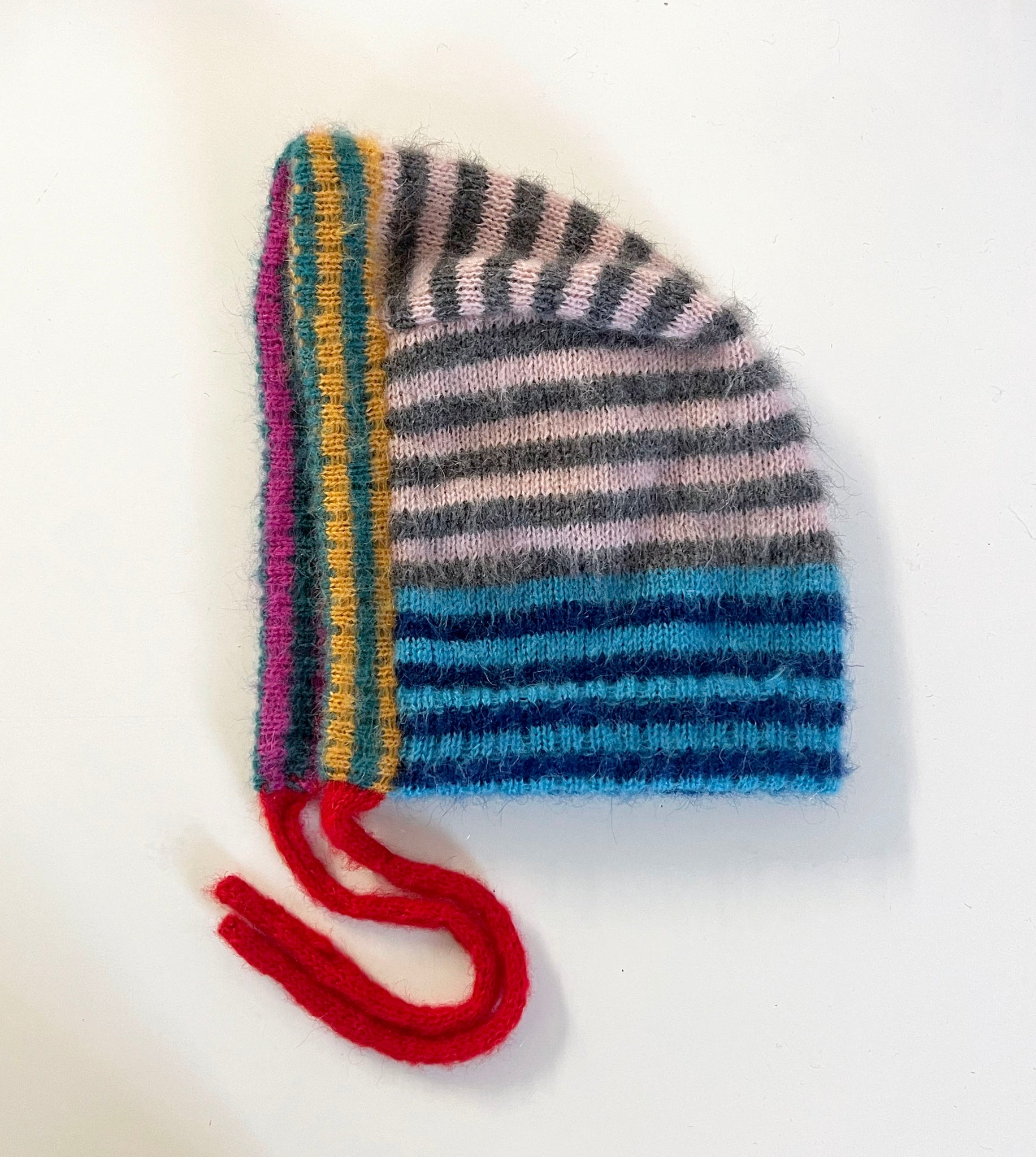 ● Cute n cosy mohair bonnet! Slightly more form fitting than the regular balaclava! Made from a mix of yellow, magenta, grey, teal, dark blue and cyan in multi stripes all over! Finished with a red fluffy tie string.