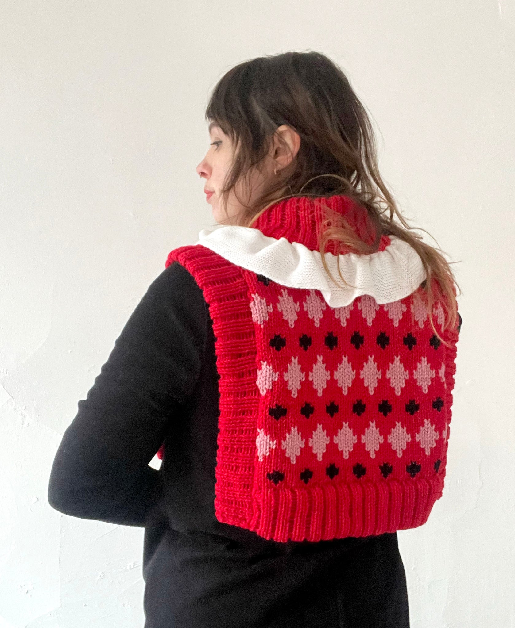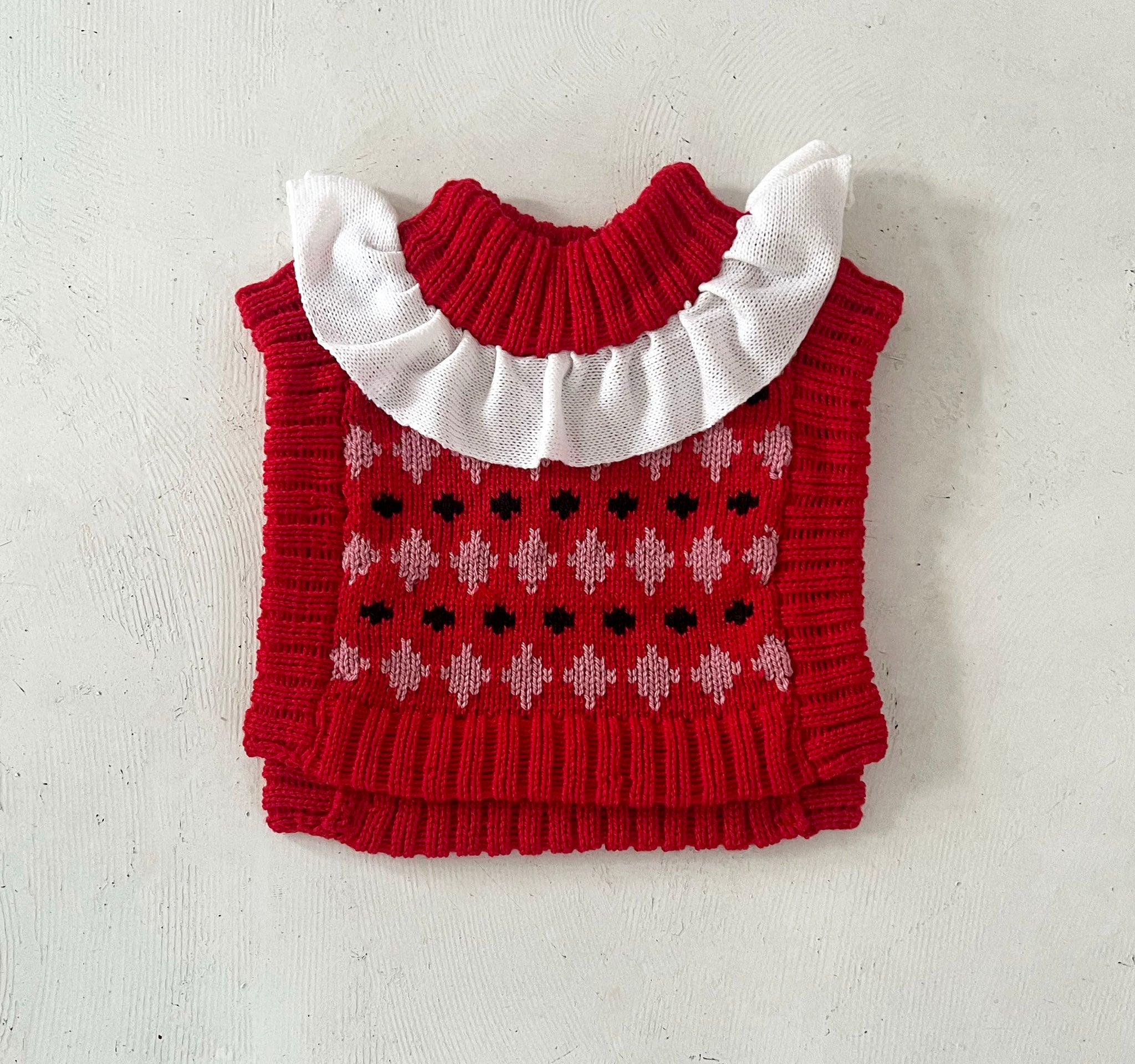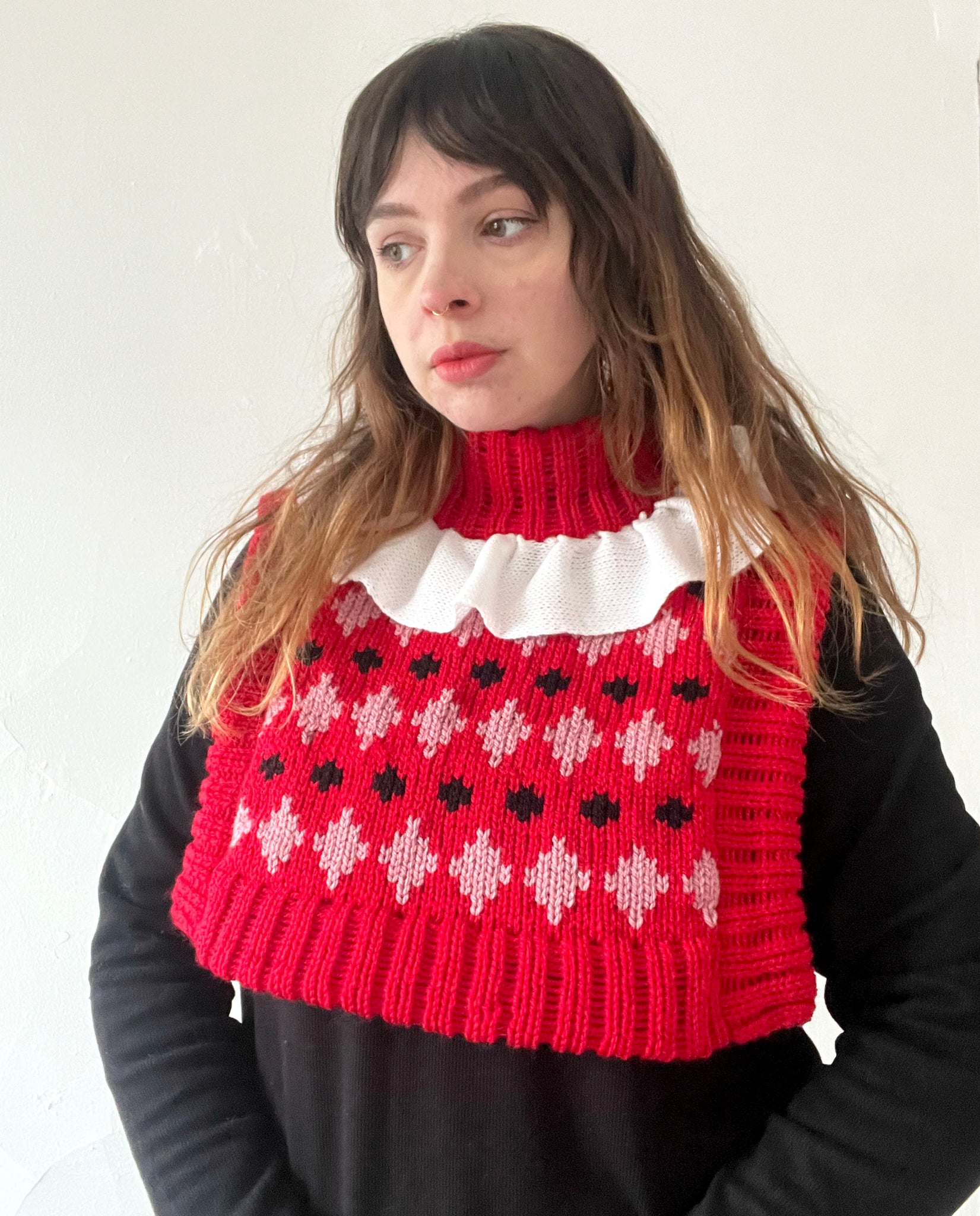 ~ Possibly my favourite variation of the dickie so far - pierrot clown insipired! Features red with pink and white diamonds and a white ruffly collar.