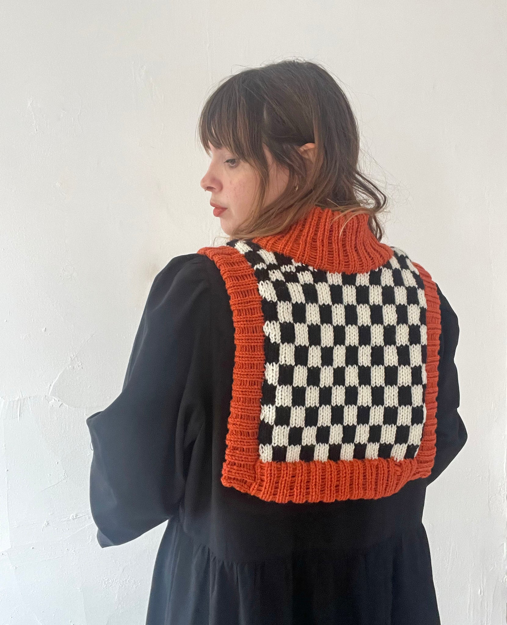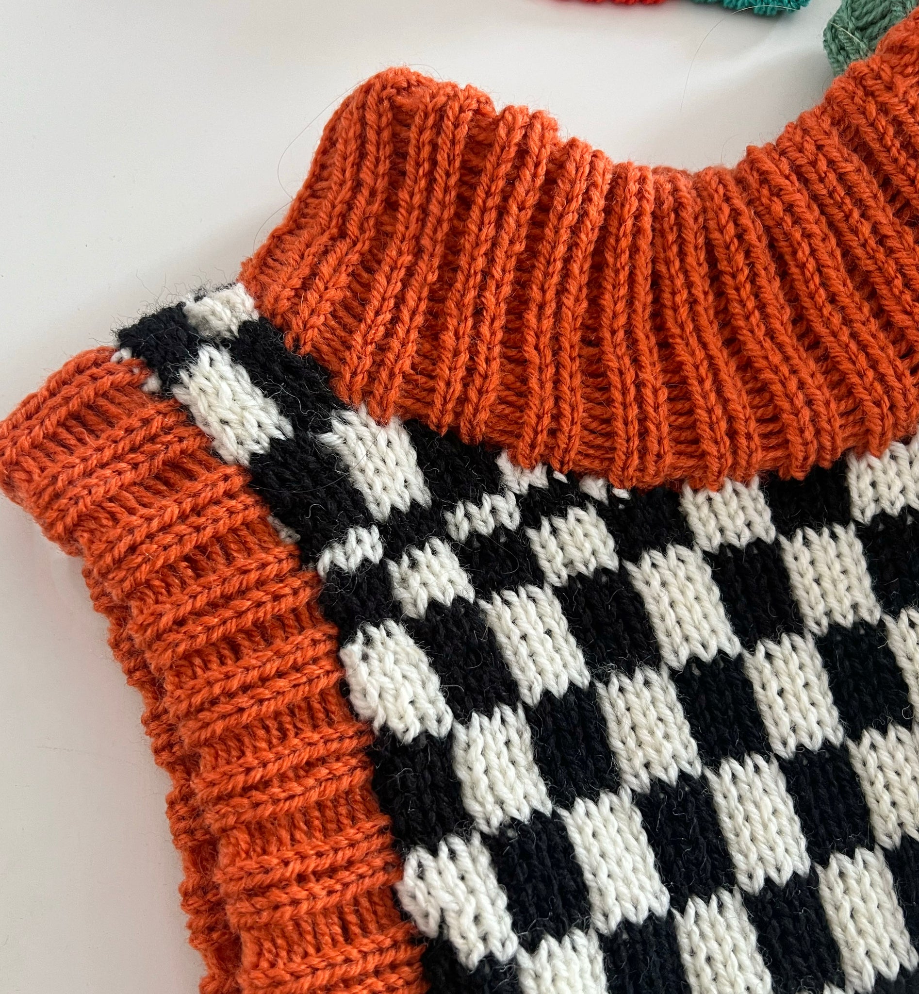 ~ Black and cream checkerboard finished with burnt orange ribbed accents. This one has a small pattern mistake on the back (see pix)