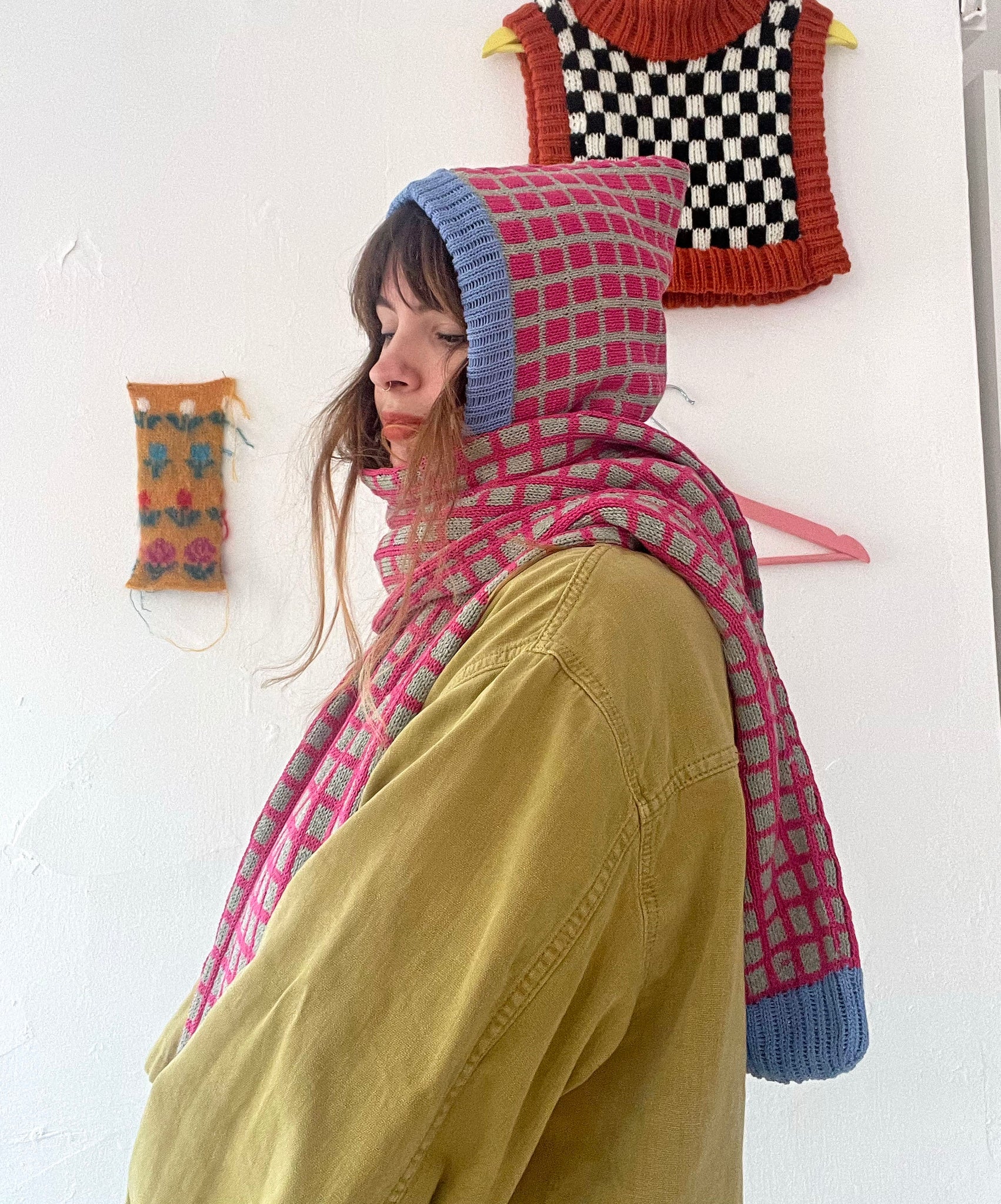 ~ A contrast of dark pink and sage green in all over grid pattern. Finished with cornflower blue ribbed accents